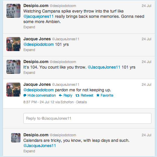 In the past three days I’ve gotten into a Twitter argument with my old nemesis @jacquejones11 (here), I predicted to the second when Chip Caray (@kapaya1234 – here) would Twitter ban me, and just a few minutes ago, the aggrieved party in the “Ryan Dempster doesn’t want to go to Atlanta because he wants to live in Ted Lilly’s guest house in LA–even though we all know that’s where Ted keeps the bodies” thing, Braves pitcher Randall Delgado took to Twitter to first post a confusing tweet about the trade “Nothing happened Abt go to Chicago.”  (Apparently he meant nothing happened about him going to Chicago.  Then to clear it up, he posted maybe the greatest five word tweet of all time.